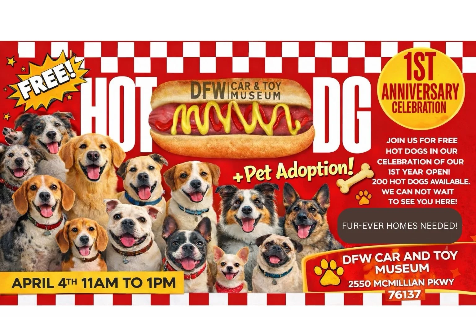 DFW Pug Rescue will be a vendor at the DFW Car and Toy Museum’s 1st Anniversary celebration and pet adoption event. The event will take place in the front parking lot and will feature adoptable pets (NOT our pugs), pet vendors, and free hotdogs for guests.