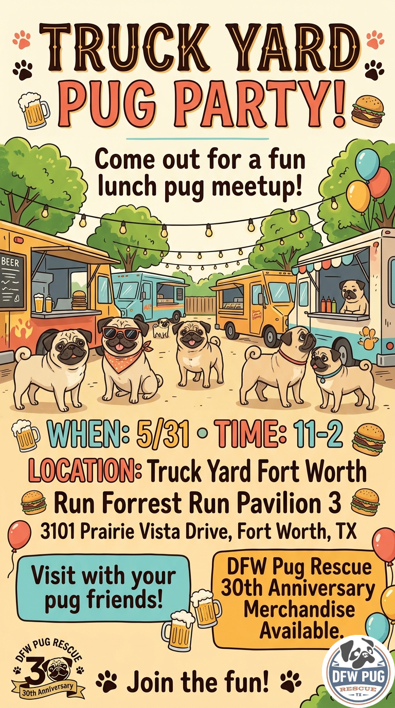 Food and drinks will be available for purchase, and we'll have our DFW Pug Rescue merchandise table set up, so be sure to stop by and say hello while you're there.